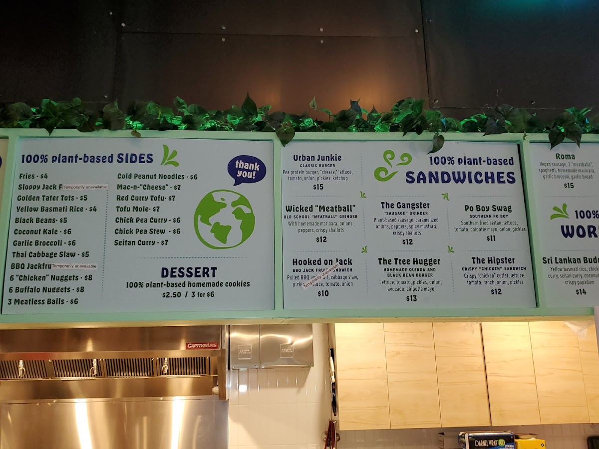 The diverse options span fresh salads, warming curries, and inventive sandwiches like the hot chicken or crispy chik'n served alongside tater tots. For those seeking international flavors, dishes such as shrimp po’ boys, Filipino chicken adobo, or Greek gyros bring a satisfying variety. Sweet treats like doughnuts and red velvet cake donuts add a simple pleasure to round out the experience.